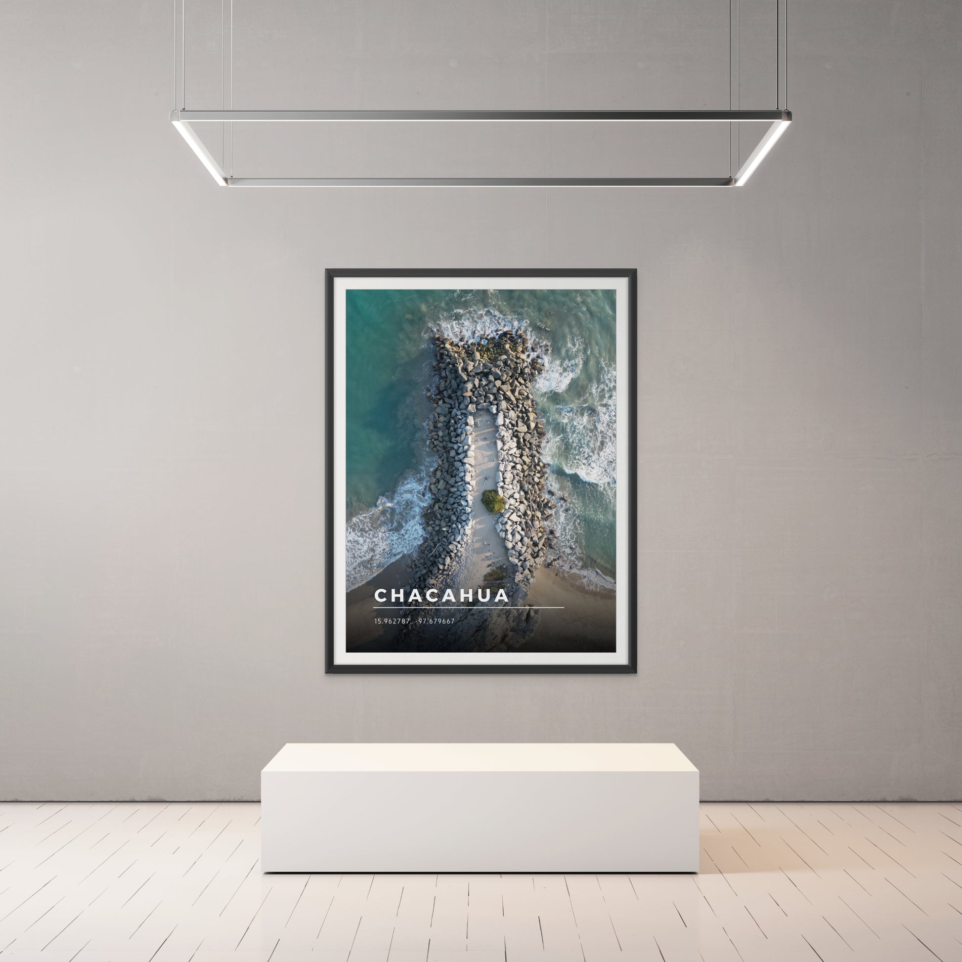 This breathtaking aerial view of Chacahua reveals its pristine beaches, rolling waves, and rugged shoreline where the ocean crashes against scattered rocks from a perspective unseen.Preserving every detail, this artwork brings the raw beauty of nature into your space.